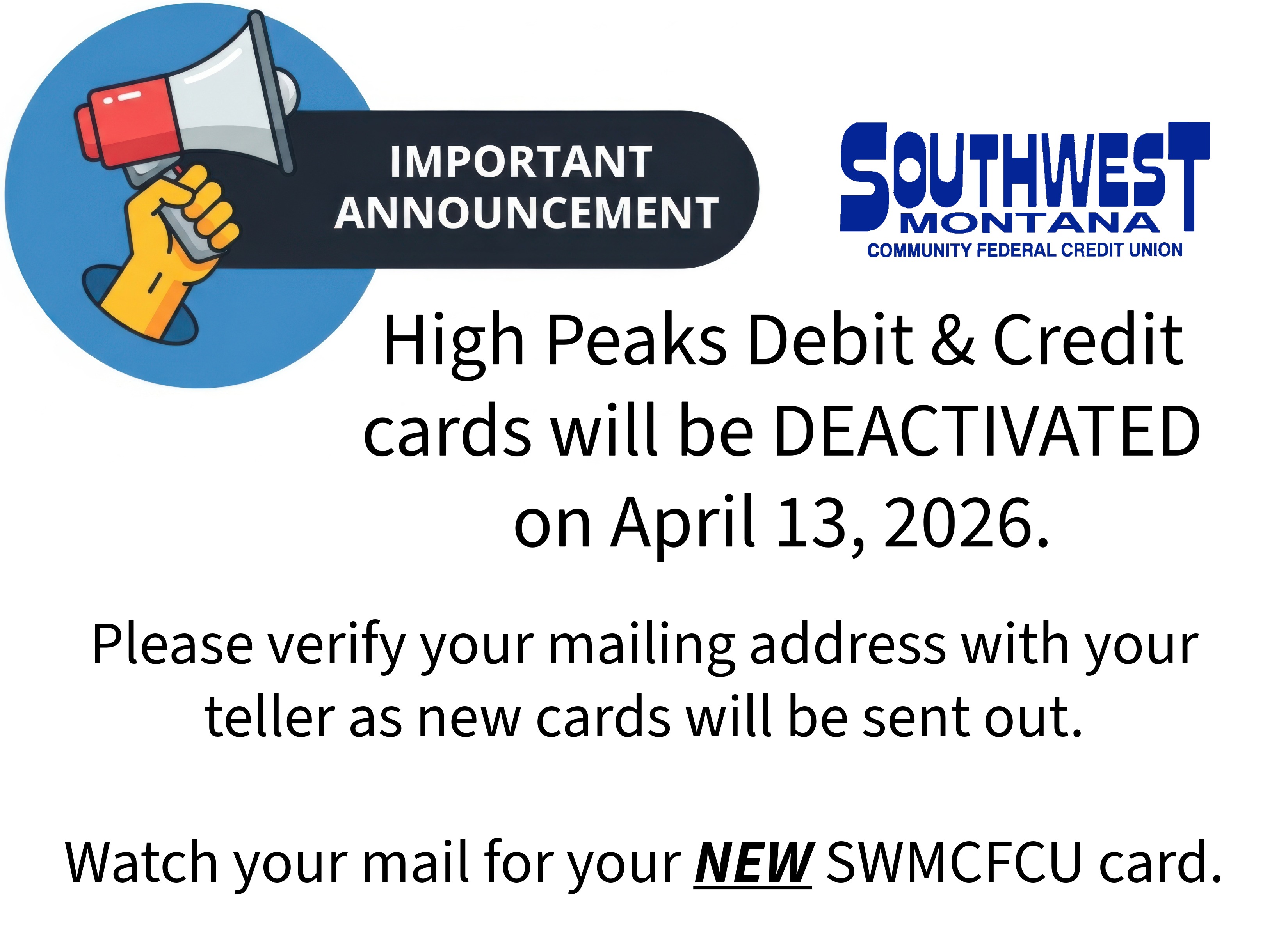 On April 13th, 2026, High Peaks will officially be merged into Southwest Montana Community Federal Credit Union. High Peaks debit cards will be inactivated, and members will need to make sure their new debit card is activated. If you need to update your mailing address before new debit cards are sent out, please see a teller to have that updated.